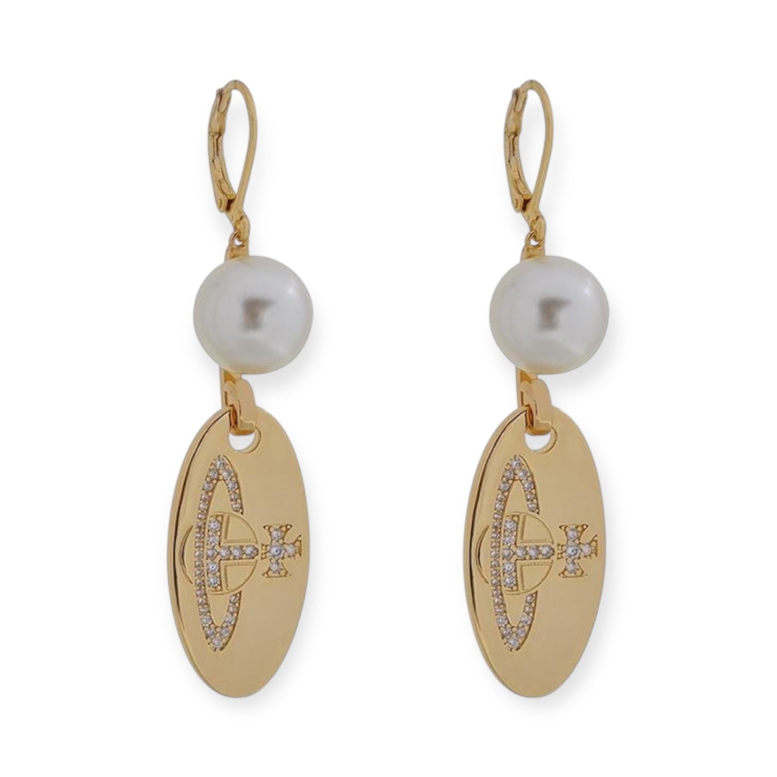 Pearl Hanging Oval Engraved Orb Gem Studded Pendant Gold & Silver Earrings (2 Colors)